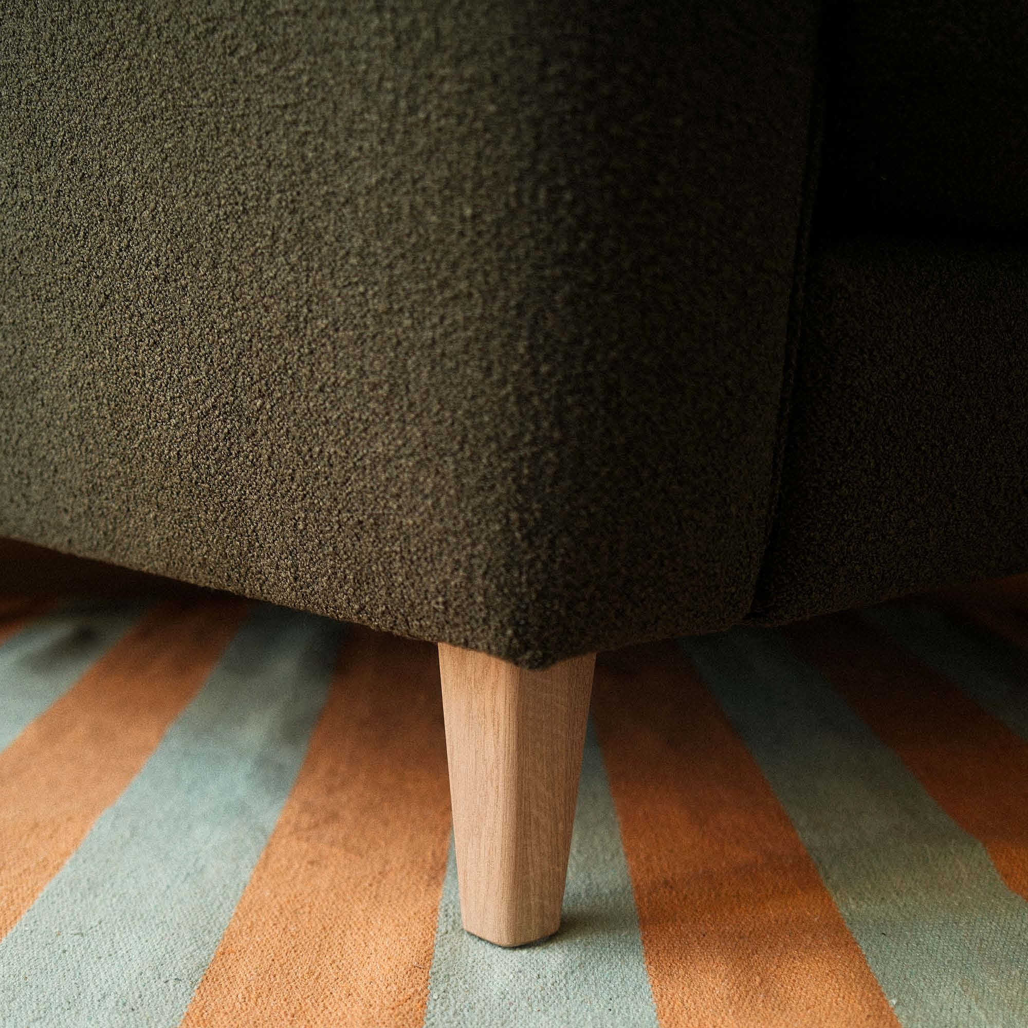Die hellen Beine des Sofas sind aus massivem Eichenholz gefertigt, was dem Möbelstück eine natürliche und elegante Note verleiht.